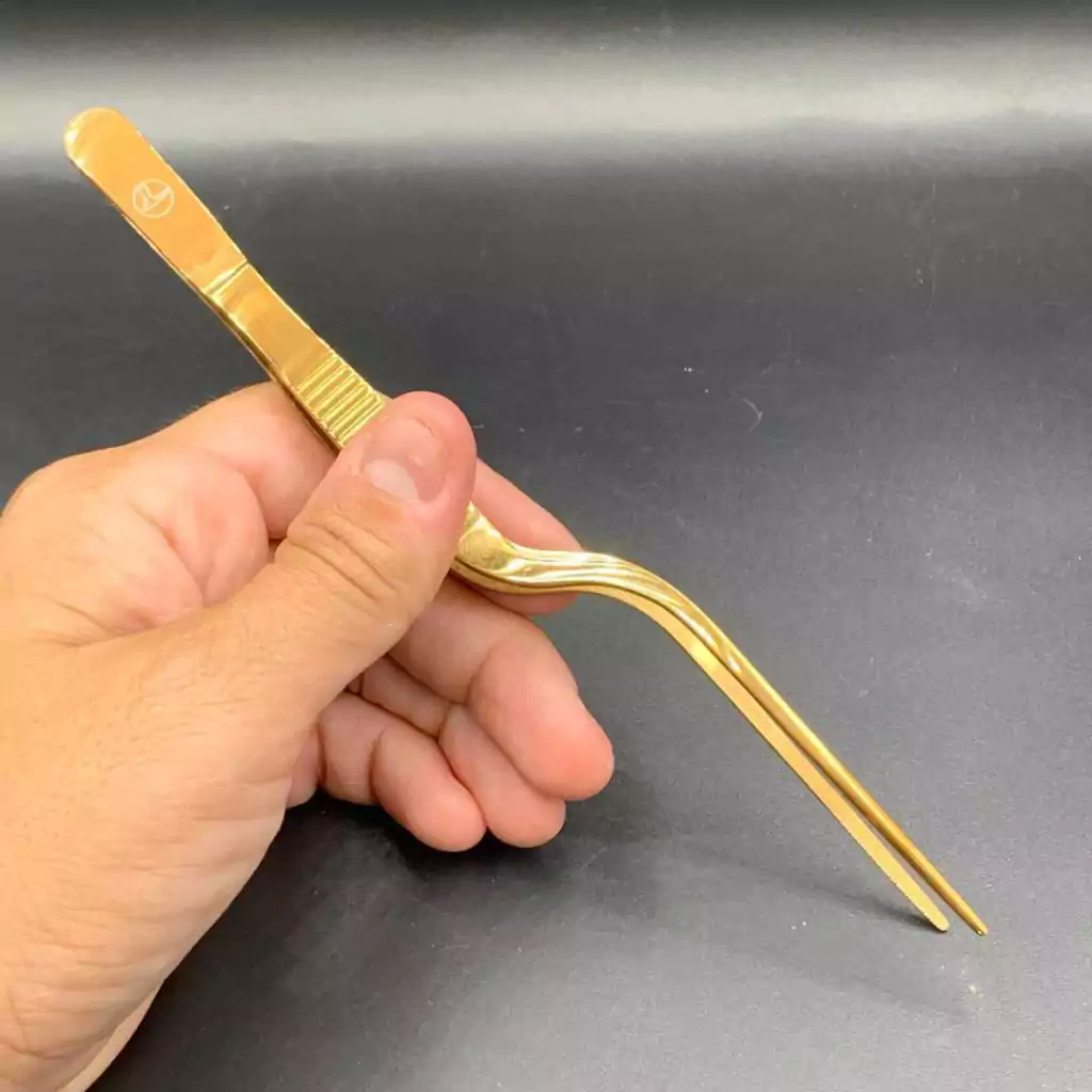 A estrutura desta pinça possui um ângulo de 30 graus que não obstrui sua visão enquanto trabalha. Com um comprimento mais curto do que as demais, ela oferece maior precisão em ações delicadas, como decorar um prato ou selecionar brotos. Seu design inclui ranhuras que facilitam o encaixe dos dedos e uma ponta com dentes serrilhados, proporcionando segurança e firmeza ao manusear e transportar ingredientes.