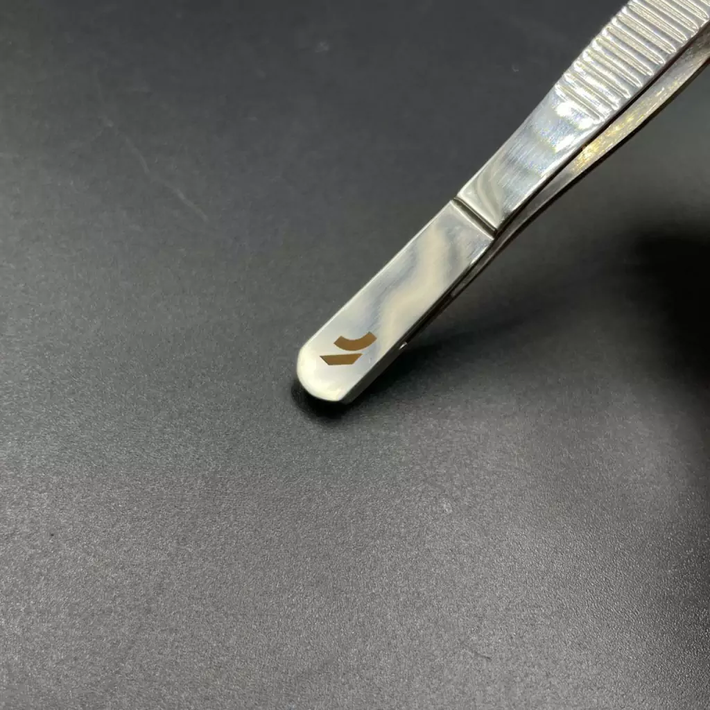 A estrutura desta pinça possui um ângulo de 30 graus que não obstrui sua visão enquanto trabalha. Com um comprimento mais curto do que as demais, ela oferece maior precisão em ações delicadas, como decorar um prato ou selecionar brotos. Seu design inclui ranhuras que facilitam o encaixe dos dedos e uma ponta com dentes serrilhados, proporcionando segurança e firmeza ao manusear e transportar ingredientes.